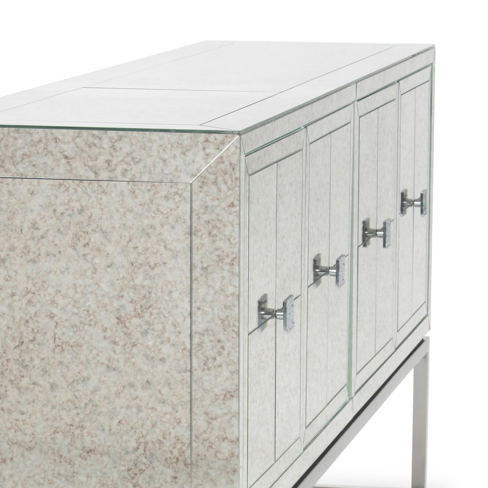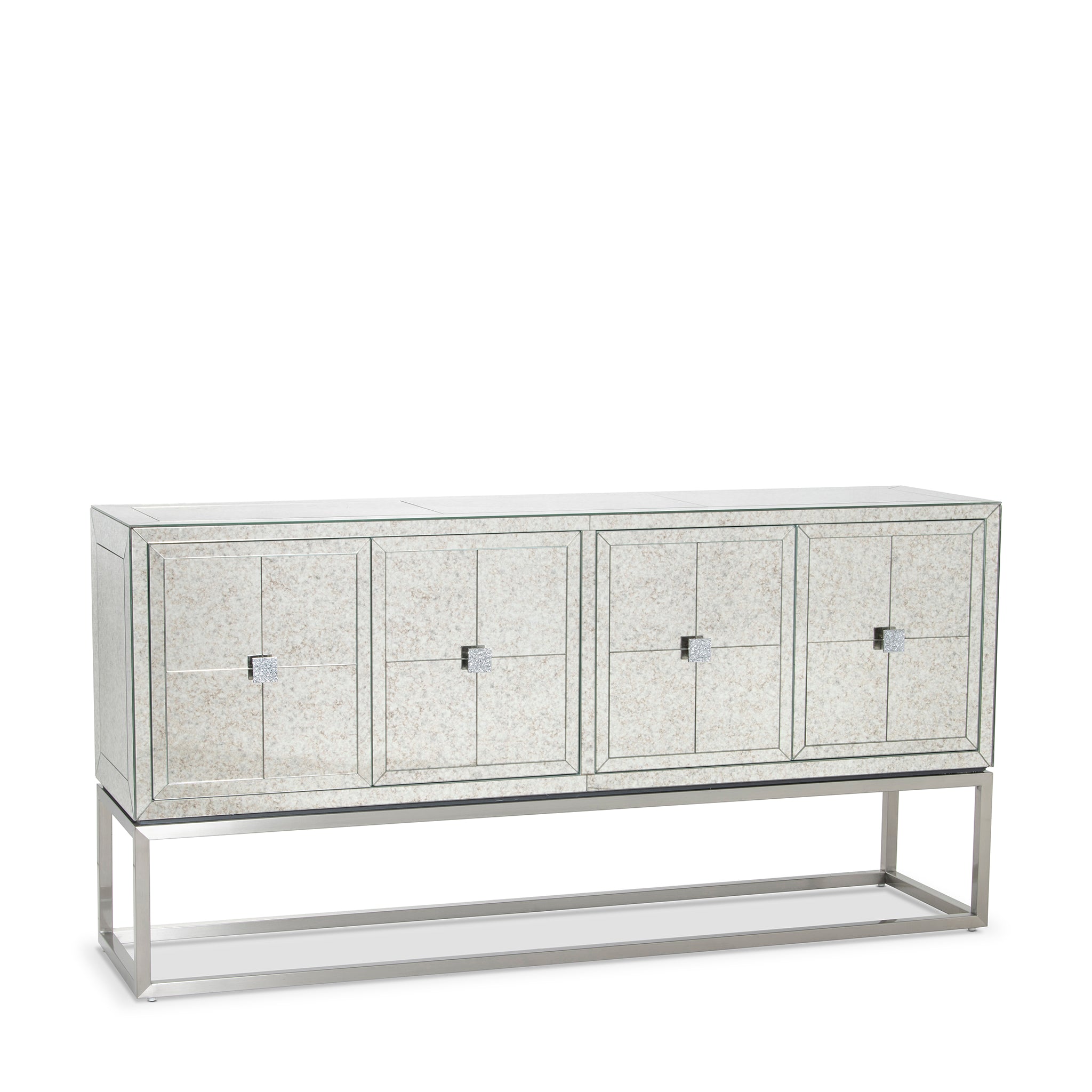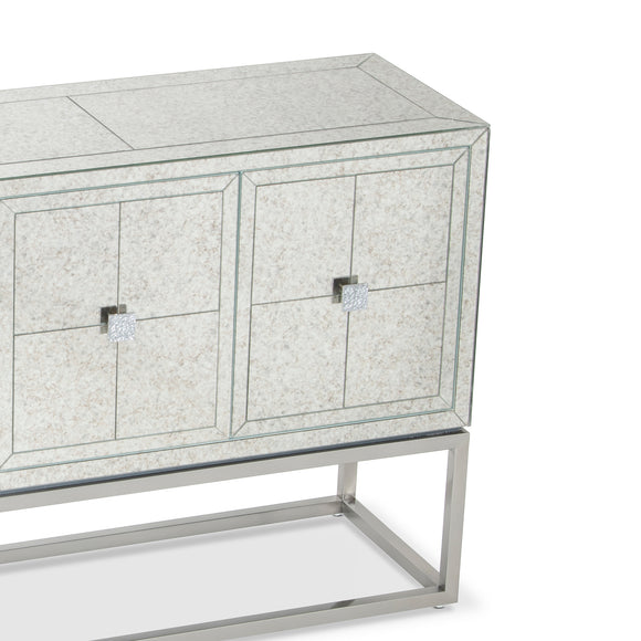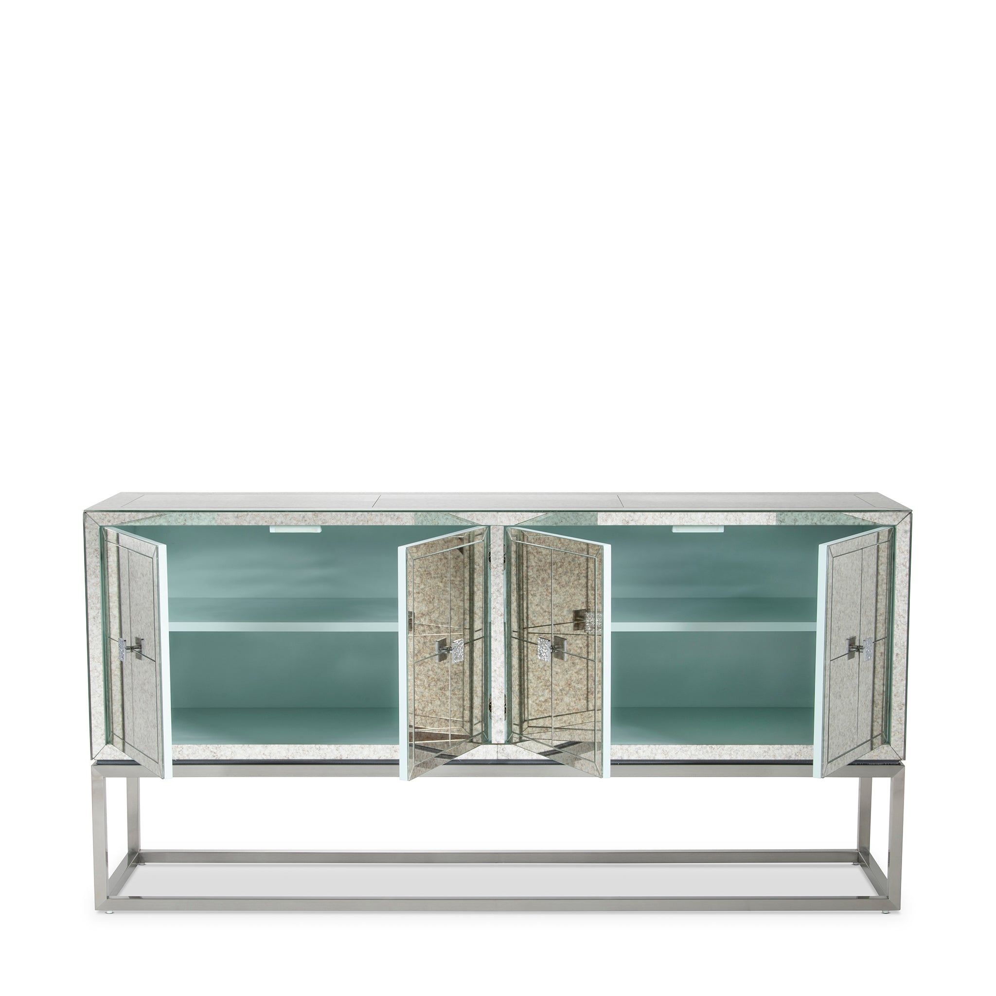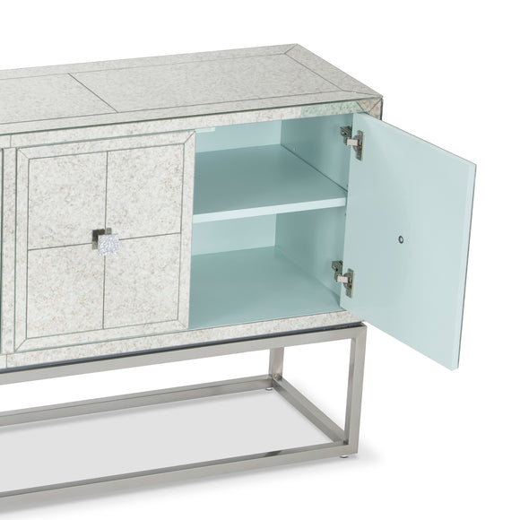 Boost up your living space, widening up the reflections in this lustrous antique mirrored sideboard. The design conveys a timeless approach by composing a wooden framework cladded with Antique Mirror. Four easy-to-open cabinets with Powder Blue Lacquered finish interiors stylishly organize your necessities. Harmonizing its refined image, the Stainless steel legs and the square-shaped center handles in an electroplated Silver finish add durability and a trendy look.