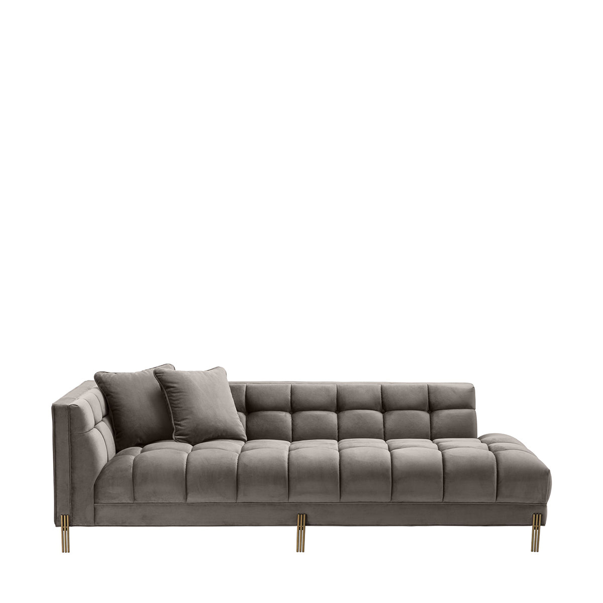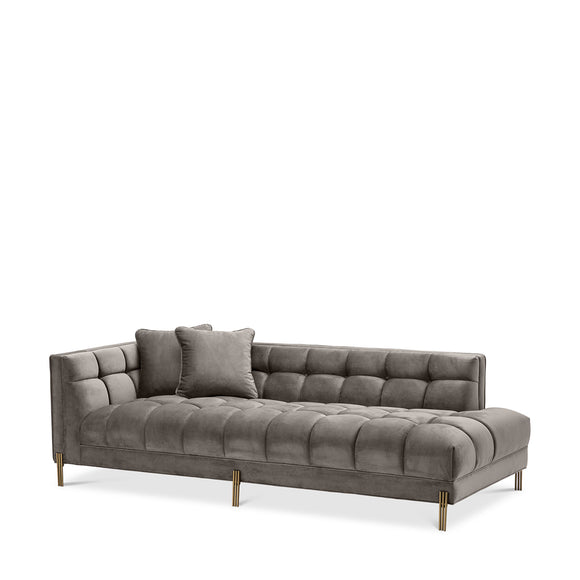 The sumptuous Sienna Left Lounge Sofa pairs comfort with high-style. This elegant modern lounge sofa comes in a tufted upholstery in mellow Savona grey velvet. Gold finished legs add extra glamour to its luxurious look.