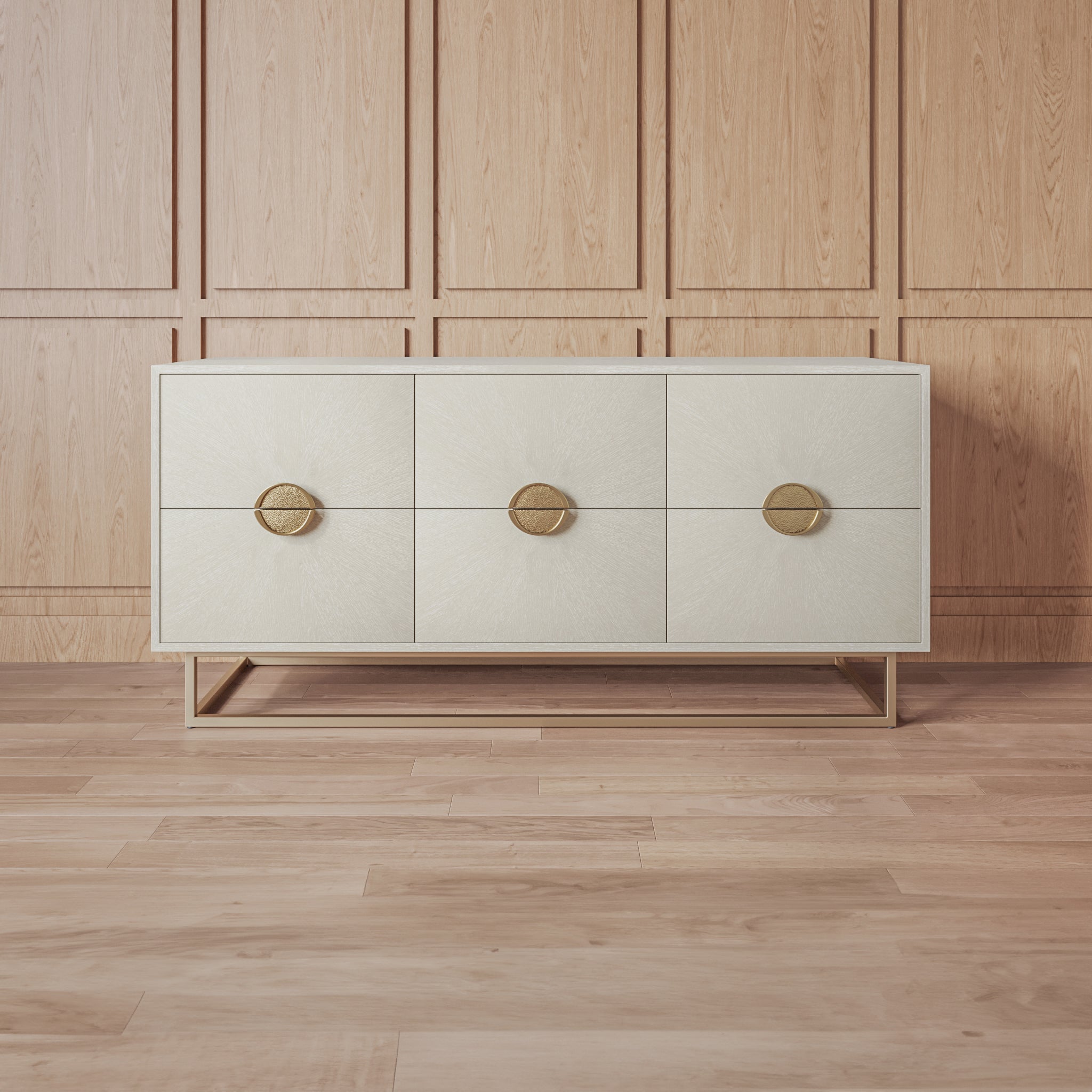 Taking the principle of form follows function, this chest of soft closing drawers adds a refreshing vibe to your bedroom. An easy yet sturdy wooden body in Light Grey Wood Veneer finish offers a bleached effect and conveys a timeless beauty through the sunburst marquetry. The casted Brushed Brass middle knobs promise a richer visual appeal. The stainless steel base electroplated in Brushed Brass finish matches the overall candor.