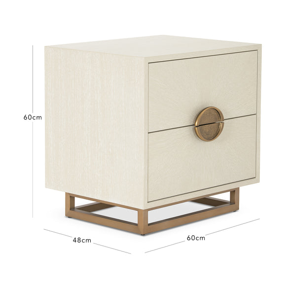 Bring a simple yet elegant nightstand into your bedroom to keep your nighttime essentials close-at-hand. A square-shaped form of Light Grey Wood Veneer in bleached effect finish is very alluring, and Sunburst marquetry is precise on the doors. Casted Brushed Brass knobs laid out on center where the two drawers meet. The robust stainless steel base in electroplated Brushed Brass finish stands perfectly, matching every border of the piece.