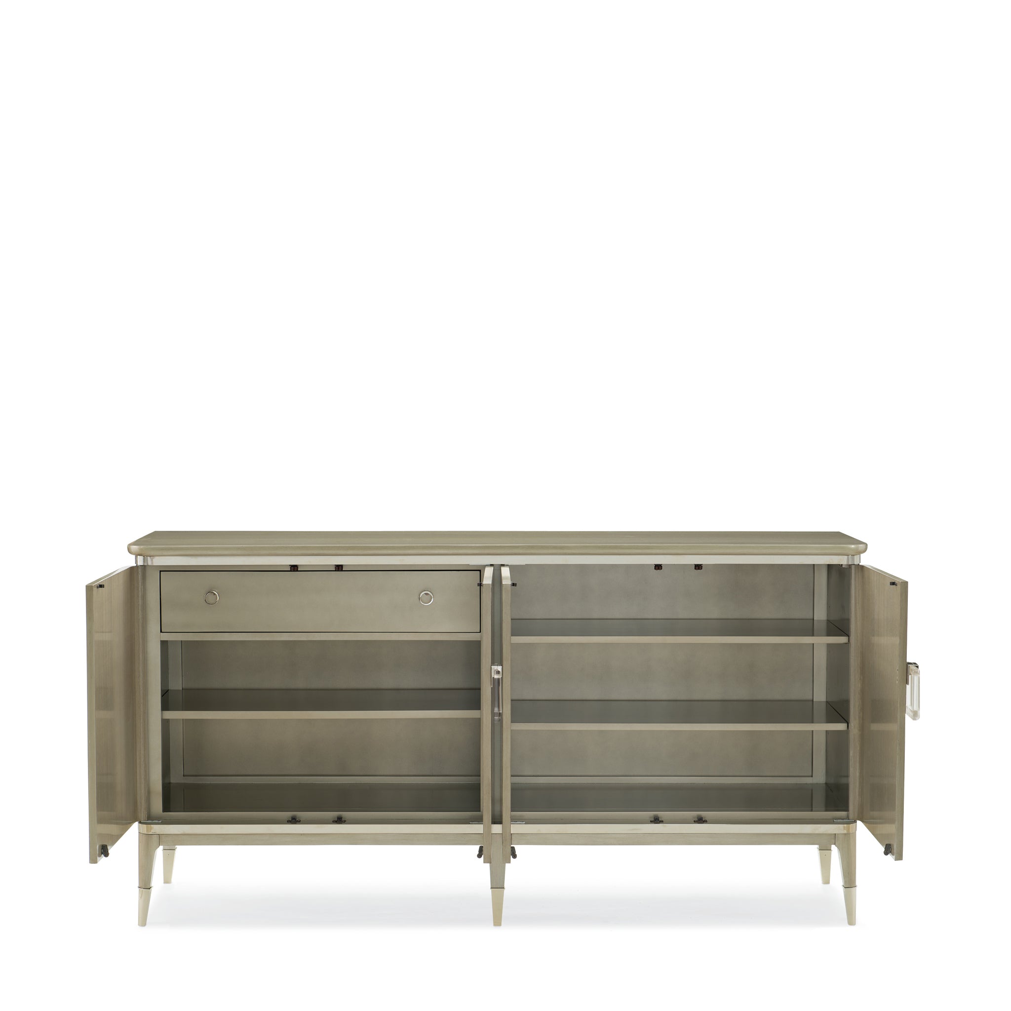 An undeniably standout piece, this contemporary unit is inspired by architectural forms. Elegantly wrapped are the arabesque-patterned leaves all over the Koto wood buffet in Champagne Shimmer. Two metallic Whisper of Gold strips and ferrules make the four-door piece radiant. To round out, three adjustable shelves with a pull-out/drop-down drawer make rich space for the tableware and more.