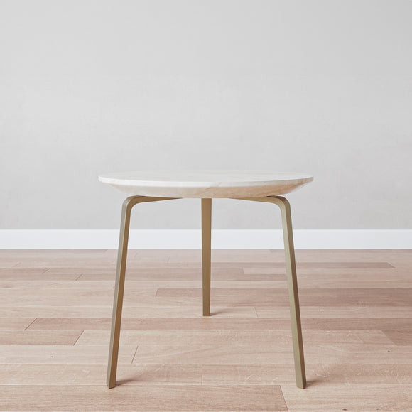 Add contemporary flair to your space with this end table, which stands elegantly on three Aluminum legs cladded in a Brushed Brass finish. It is topped with Local Indonesian Marble in a Beige color, offering a flat, smooth surface to hold your beverages nearby.